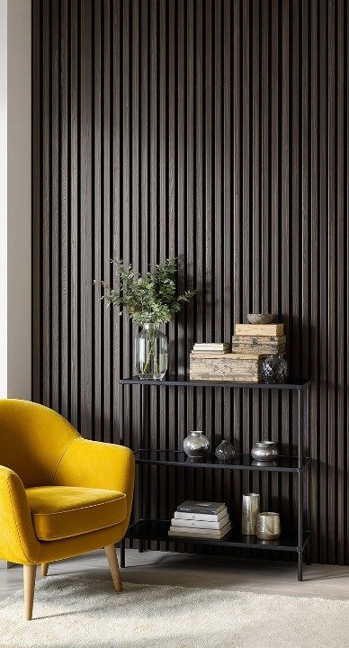 Talk about bold contrast! The dark wood paneling creates such a dramatic backdrop—it’s cozy yet utterly modern. I love how the vibrant, mustard yellow armchair just pops against that deep shade. The black, industrial-style shelving unit is styled perfectly with books and glass vases, making it a functional and beautiful reading nook.