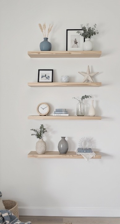 You can’t go wrong with simple, rustic floating shelves on a crisp white wall! This arrangement is so airy and light. The natural wood tones and the serene palette of blues, grays, and whites create a calming, coastal-inspired vibe. These shelves are perfect for showcasing small framed art, minimalist ceramics, and simple greenery like dried grasses and eucalyptus.