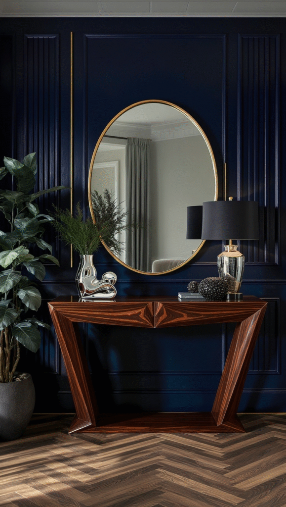 Wow, this is true luxury! The rich, moody navy wall with traditional panel moulding sets a glamorous stage. The dark color is instantly elevated by the gold trim accents and the oversized, gold-framed mirror. But the real star is that incredible, dark wood console with its striking, angular design—it’s a sculptural masterpiece.