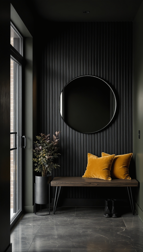 Here’s another stunning example of dark paneling, this time in matte black. It brings so much depth and texture to this hallway. The large circular mirror is a classic choice that breaks up the vertical lines. Adding a simple wooden bench, soft yellow velvet cushions, and a potted plant creates a welcoming, contemporary moment right by the front door.