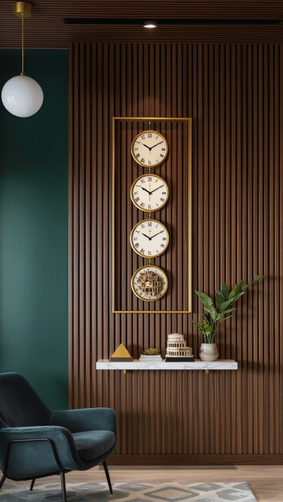 This is a masterclass in combining warm wood paneling with a rich accent color—that deep teal-green is everything! The bold combination grounds the space, while the unique arrangement of four clocks in a large gold frame acts as a fantastic, eye-catching focal point. A simple white marble shelf provides a lovely spot for minimalist trinkets.