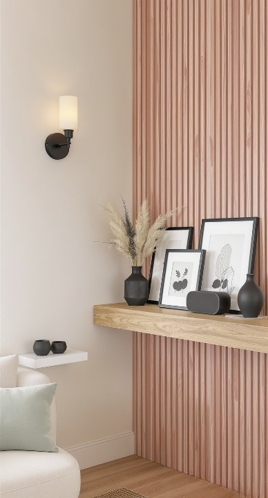 If you love the panel look but prefer something softer, check out this lovely, muted pink-hued wall. It’s modern and feminine without being overly sweet. The unfinished wood floating shelf brings in a natural texture, perfectly styled with framed art and matte black vases. The small wall sconce adds a perfect cozy glow.