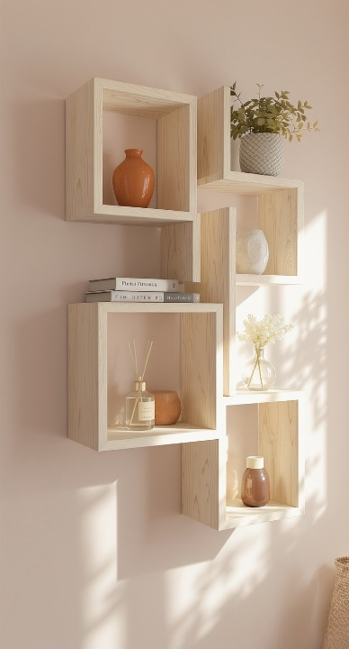 How fun is this asymmetrical floating cube arrangement? These aren’t your typical shelves—the staggered, overlapping design creates an amazing, contemporary 3D effect. The light wood finish keeps the look clean, allowing the small pops of orange and the simple white and green plants to truly stand out. Great for displaying cherished objects!