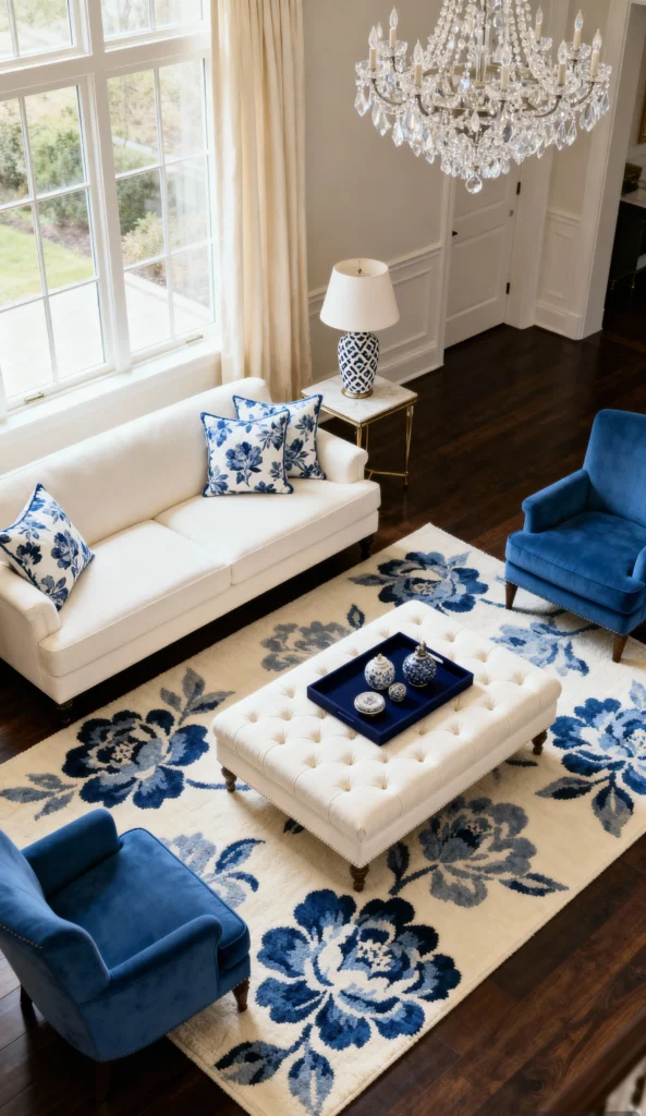 The rich navy blue in that gorgeous, oversized floral rug is just everything. Paired with the crisp white sofa and those plush velvet accent chairs, it creates such an elegant and inviting space. The dark wood floor adds a nice warmth and contrast, making those white and blue elements really pop. And I can’t ignore that glamorous crystal chandelier—it elevates the whole room! It feels sophisticated yet totally comfortable.