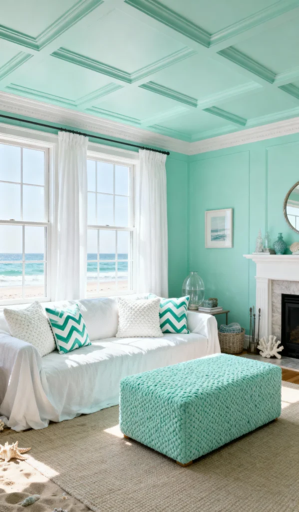 How fun is that ceiling?! ) Painting the coffered ceiling a bright aqua/teal adds so much personality and color! The white slipcovered sofa and curtains feel super relaxed, like a beach towel you can just flop onto. The large, knitted aqua ottoman and the chevron-patterned pillows really tie the fun colors together. Even the sand on the floor adds to the right-off-the-beach casual atmosphere.