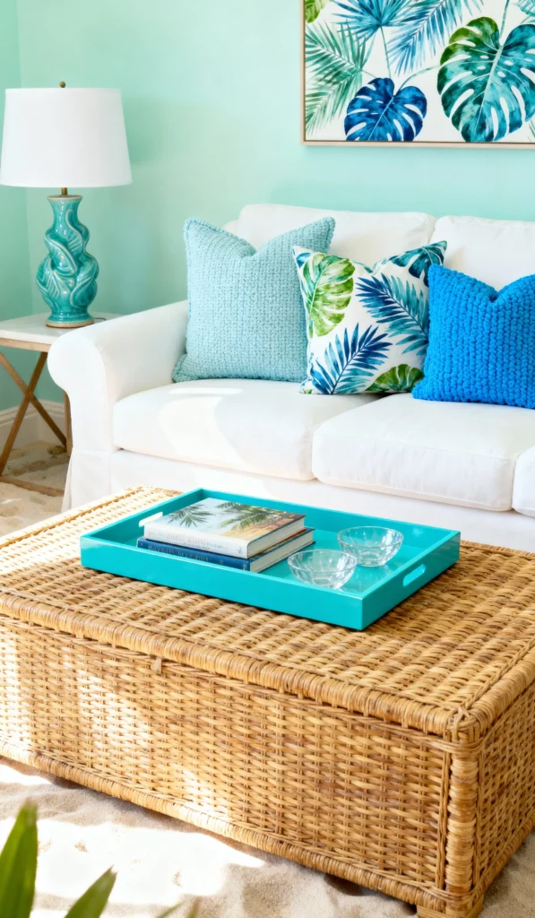 This setup is the perfect blueprint for a relaxed, happy living room! The star of the show has to be that chunky, woven wicker coffee table. Isn’t it fantastic? It instantly grounds the space with natural texture, making the whole room feel less formal and super welcoming. Against the crisp white couch and the soothing aqua wall, that natural fiber pops beautifully. Then, look at those accents! The turquoise serving tray, the palm-print pillows, and that incredible glass lamp base all work together to scream “tropical getaway.” It’s a masterclass in using color and texture to create a vibrant yet serene retreat.