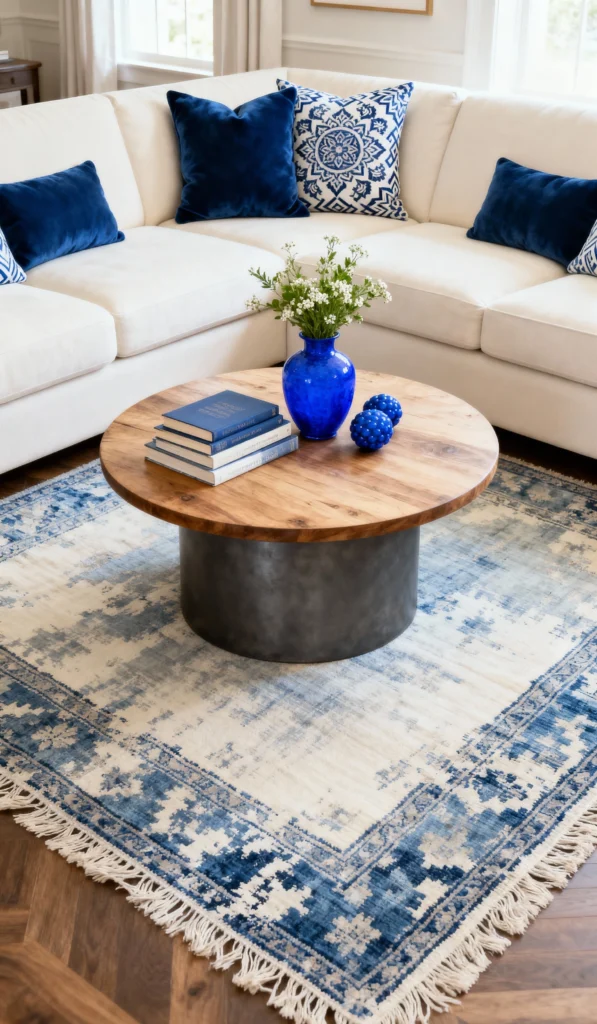 The distressed blue and white rug grounds the space beautifully, and that coffee table is a masterpiece—the rough-hewn wooden top against the industrial-style metal base is such a cool juxtaposition. The classic white sectional is made instantly cozy with those velvety deep blue cushions and the patterned lumbar pillow. It’s a perfect blend of rustic and refined.