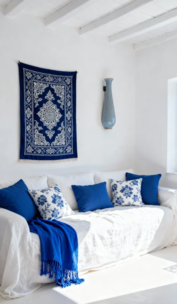 The whitewashed walls and ceiling are so clean and bright, reflecting all that beautiful light. The simple white linen slipcover sofa is the perfect canvas for those classic blue and white floral and solid pillows. That dark blue tapestry on the wall adds a lovely, traditional Mediterranean touch. It’s effortlessly simple, breezy, and completely relaxing.