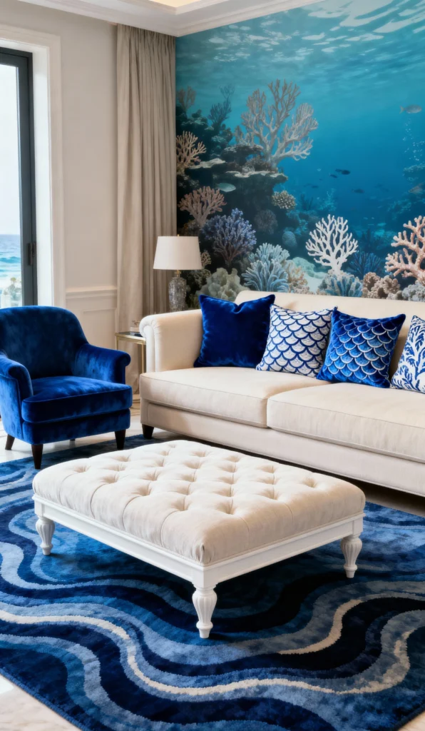 This room is an absolute dream! The custom coral reef mural wall is such a unique and mesmerizing way to bring the ocean indoors. The rug’s abstract blue waves perfectly complement the mural. The furniture is classic and plush—a beautiful cream sofa and a statement navy velvet armchair. The mix of patterned blue cushions gives the seating texture and depth. It’s truly an immersive coastal fantasy.
