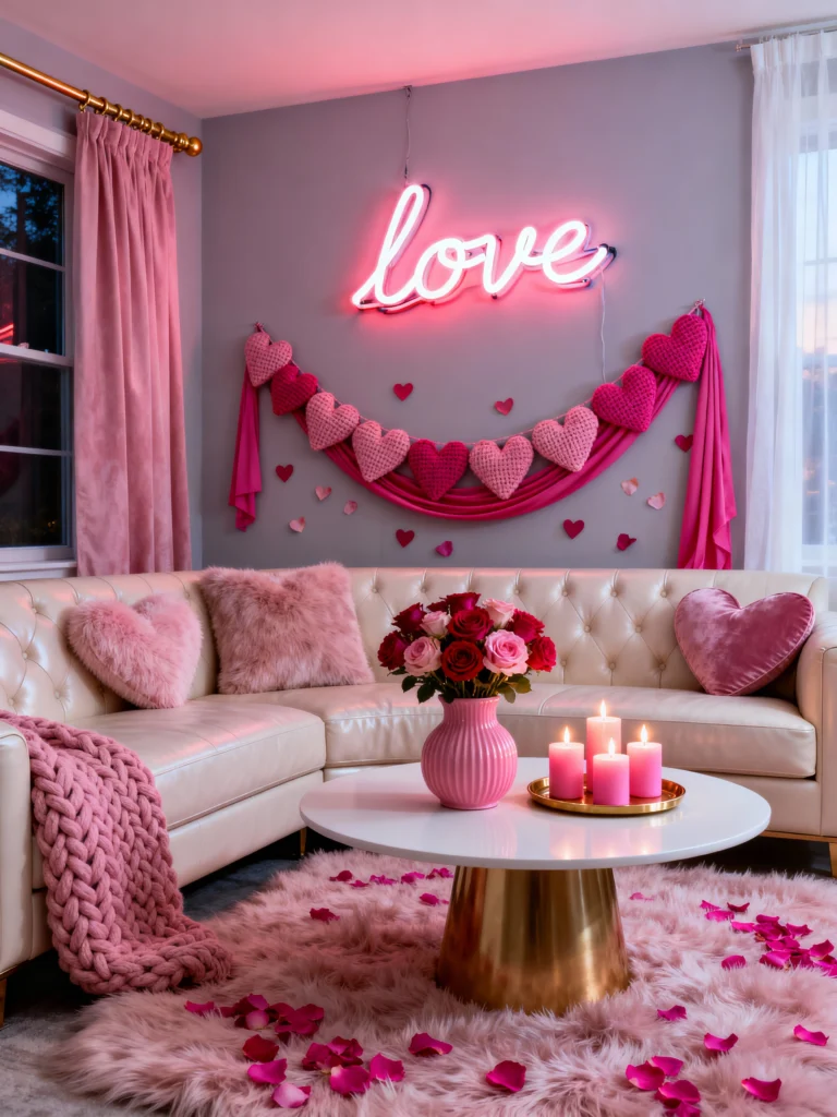 If your style is a bit more modern and “Instagrammable,” this one is for you. The “Love” neon sign is a total game-changer—it adds that cool, late-night lounge vibe instantly. I love how the knitted heart garland drapes perfectly underneath it; it adds a soft, DIY touch to the sleek neon.