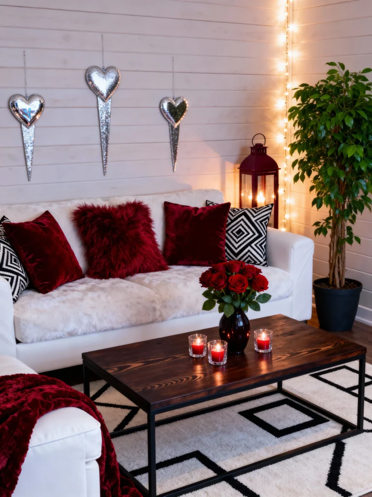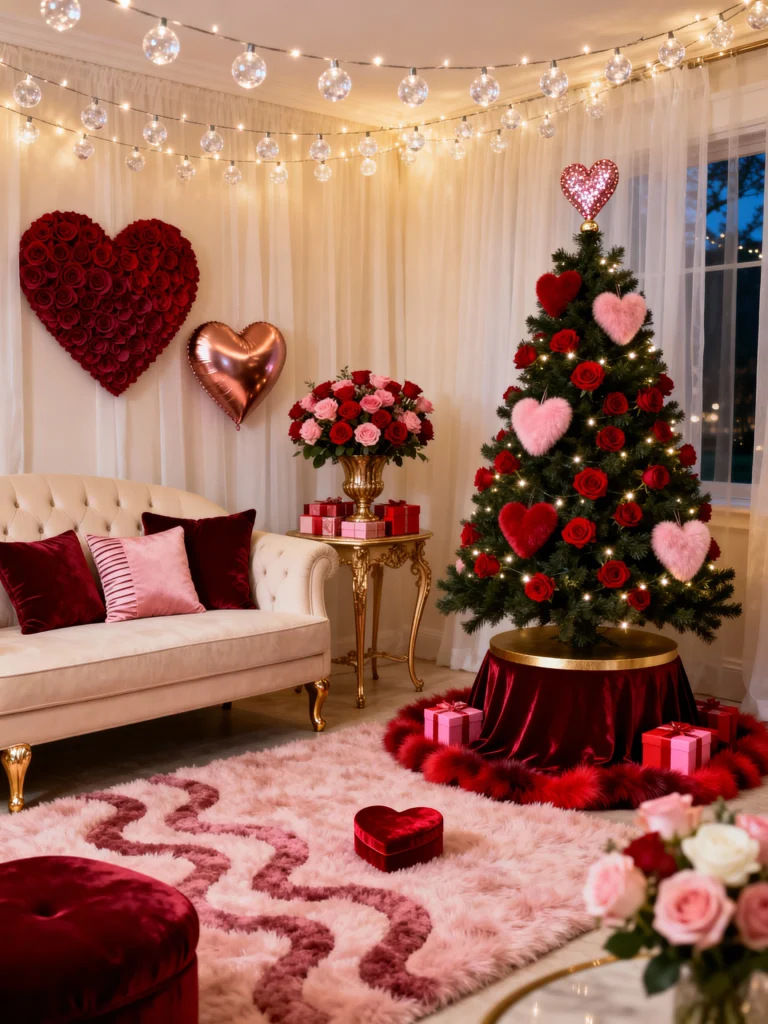 If you have a neutral sofa like the one here, adding velvet pillows in burgundy and blush is the easiest way to “Valentine-ify” your living room without a total overhaul. Also, don’t miss that rose-covered heart on the wall—it’s such a statement piece! This look is all about texture: faux fur rugs, satin tree skirts, and glowing globe lights. It’s elegant, warm, and seriously moody.