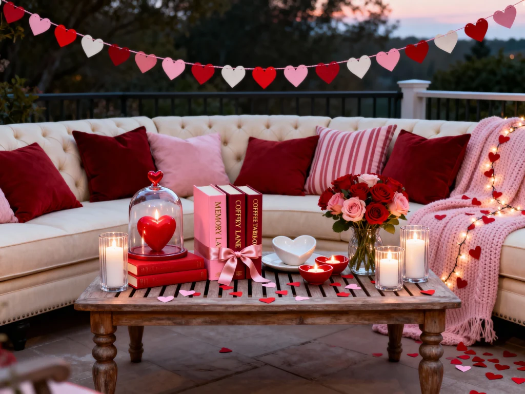 Who says Valentine’s Day has to stay indoors? This outdoor setup is making me want to grab a blanket and watch the sunset immediately. The heart bunting draped across the railing is such a simple DIY, but it totally changes the vibe of the deck.