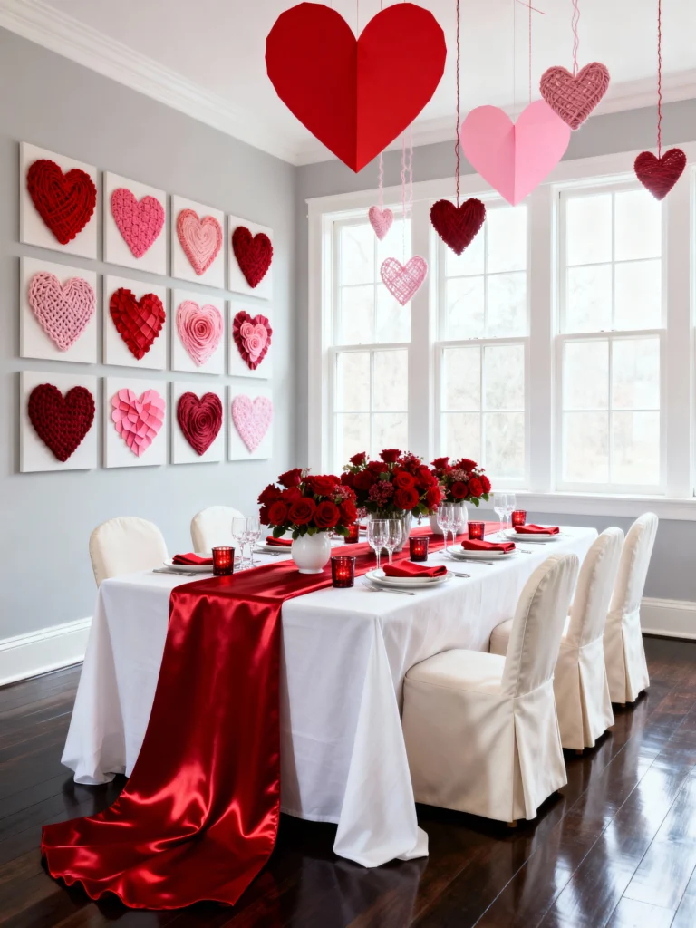 Who knew a dining room could look this sophisticated with hearts hanging from the ceiling? This setup is perfect for a formal Valentine’s dinner. The grid of heart art on the wall is a brilliant way to fill a large space with color.