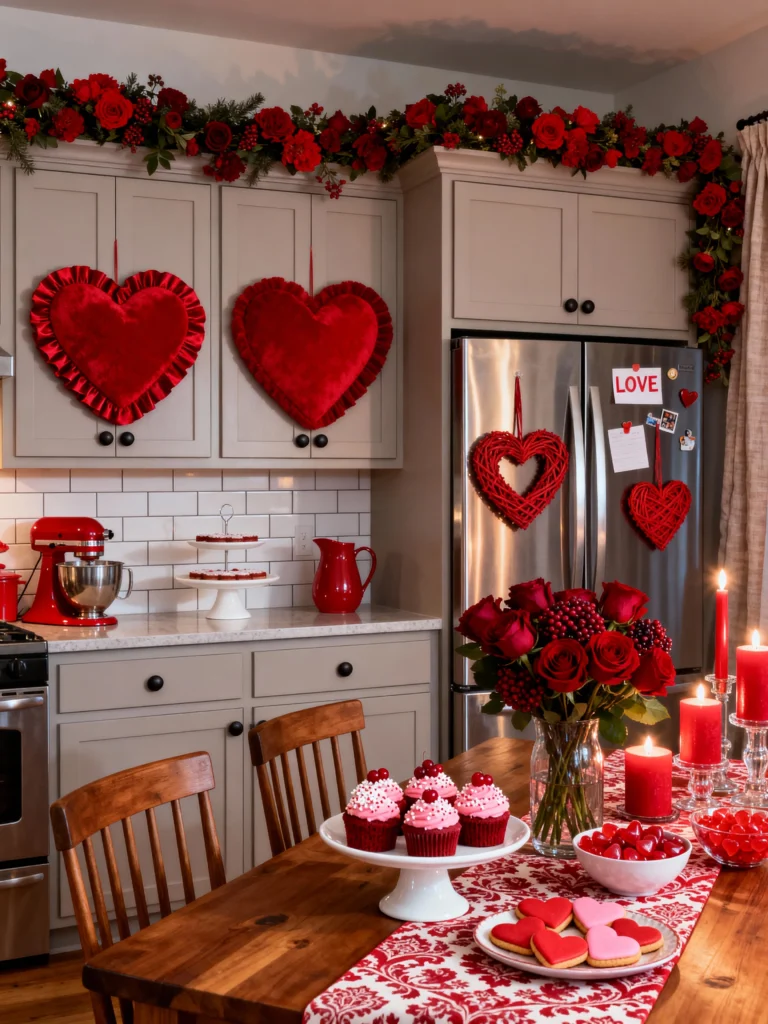 Adding oversized velvet hearts to the cabinet doors and some themed treats on the counter makes the whole space feel festive. Even just a bowl of heart-shaped candies and some red candles on the table can make breakfast feel like a special occasion.