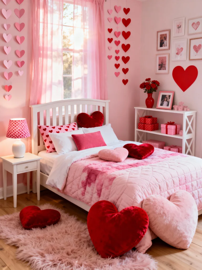The mix of heart-shaped plush pillows makes the bed look so inviting. Pro tip: if you don’t want to change your whole comforter, just swap out your shams and add a themed throw blanket. It’s instant romance!