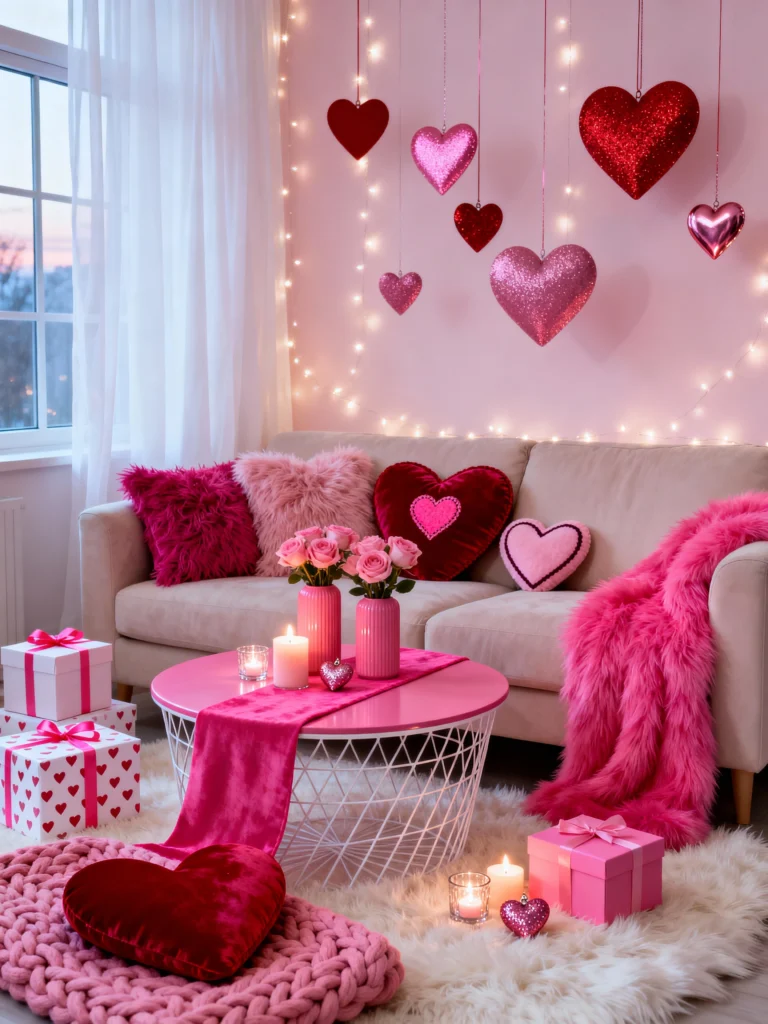 The hot pink fuzzy throw is a total “wow” piece. I love how the gifts are wrapped in heart-patterned paper—it makes the decor feel like a complete package. This is the perfect backdrop for a Galentine’s gift exchange!