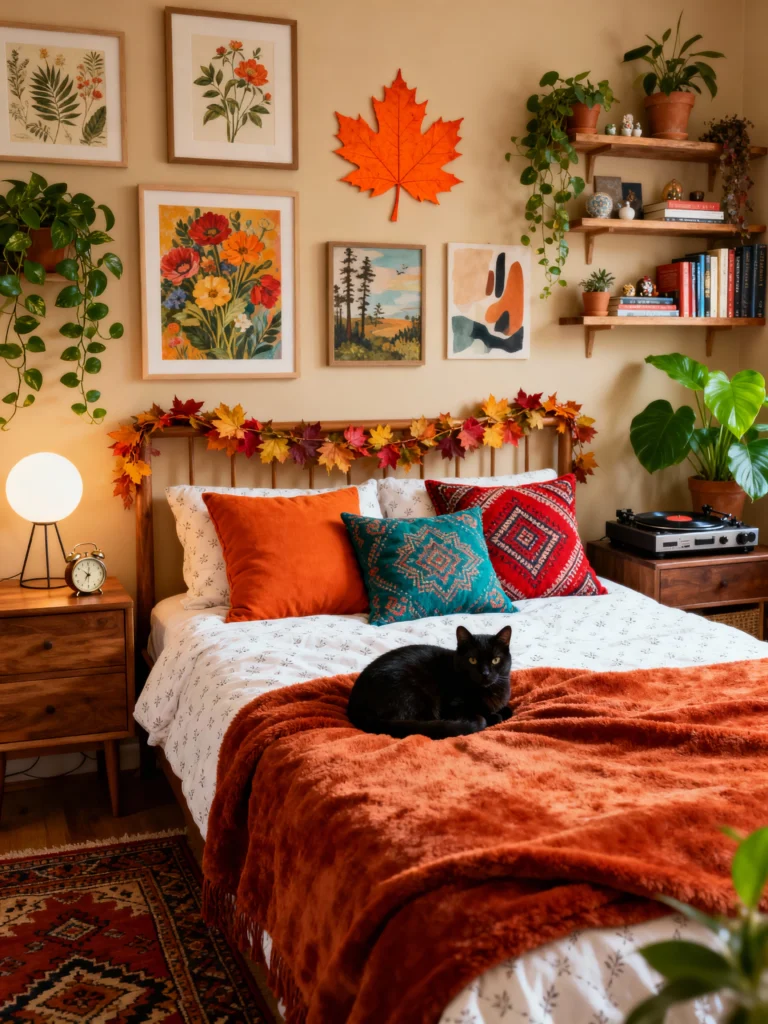 This room feels like a warm hug on a rainy Sunday. The star of the show is that gorgeous burnt orange throw—it instantly grounds the room and makes you want to dive right into bed. I love how the owner leaned into the botanical theme without it feeling like a science lab; the mix of framed ferns and that oversized orange maple leaf on the wall adds such a whimsical, seasonal touch. Plus, can we talk about the black cat? The ultimate accessory for any home!