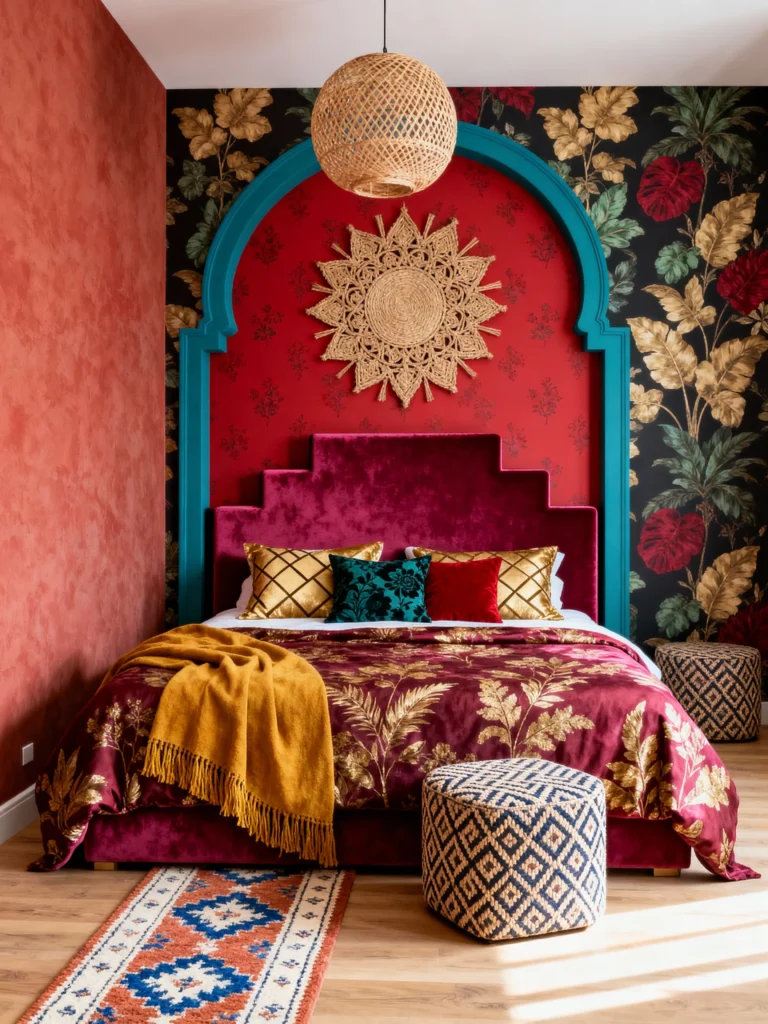 This is pure drama. The architectural teal arch built around the bed is a genius way to create a “zone” in a room. It frames the bed like a piece of art. The wallpaper—a dark, moody floral—paired with the sunburst wall hanging gives off major bohemian-royal vibes. The gold accents in the bedding and pillows make it feel incredibly luxurious. It’s the kind of room you walk into and immediately feel like royalty.