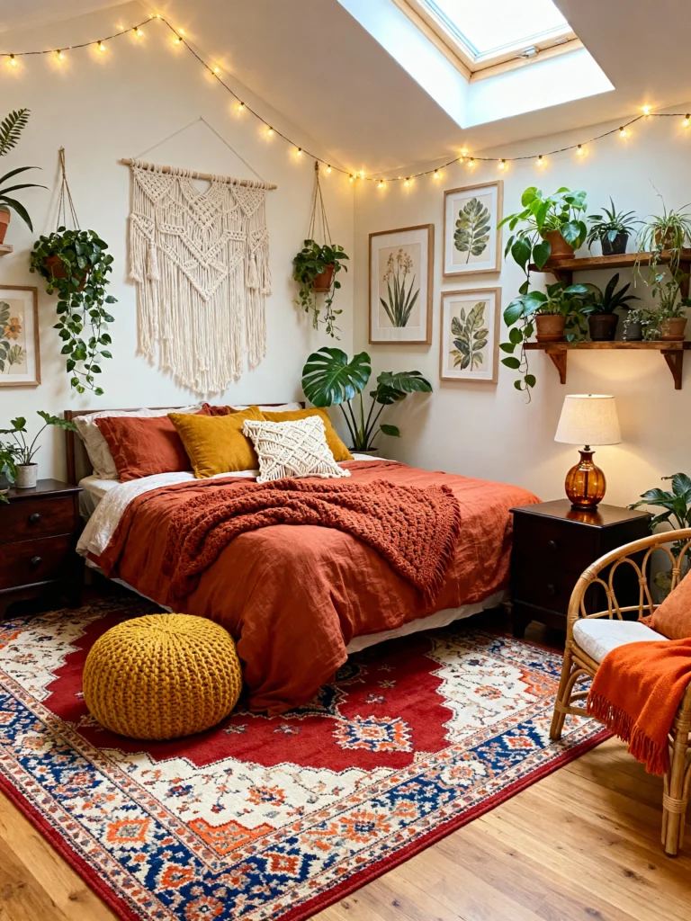 If you have a skylight, use it! This room feels so airy despite being packed with personality. The string lights draped across the ceiling create a magical, starry-night vibe. The color palette is very autumnal—think rust, mustard, and deep red.