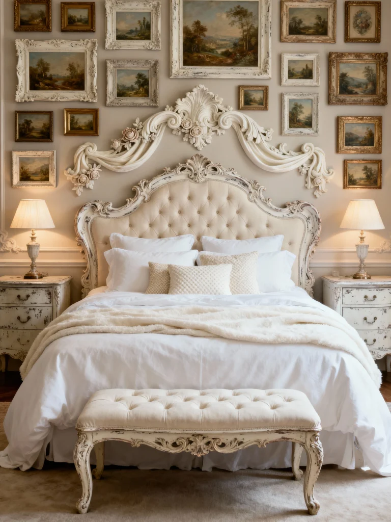This is straight out of a Parisian dream. If you’re into the “Shabby Chic” or “French Provincial” look, this is your gold standard. The distressed wood on the bedside tables and that ornate, creamy headboard create such a sophisticated, timeless vibe. What really makes this work is the gallery wall of vintage landscapes. Instead of one big piece of art, the cluster of smaller frames makes the ceiling feel higher and the room feel like it has a history. It’s elegant, airy, and totally romantic.