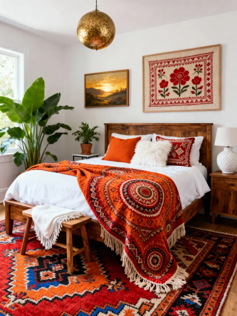This room is proof that you don’t need a million colors to make a statement—just one really good one. The saturation of the oranges and reds here is incredible. That heavy, patterned textile draped over the bed gives it such a global, traveled feel. I’m also a huge fan of the lighting choice here; that brass globe pendant adds a touch of “glam” to an otherwise very earthy, wooden-heavy space. It’s the perfect balance of rustic and refined.