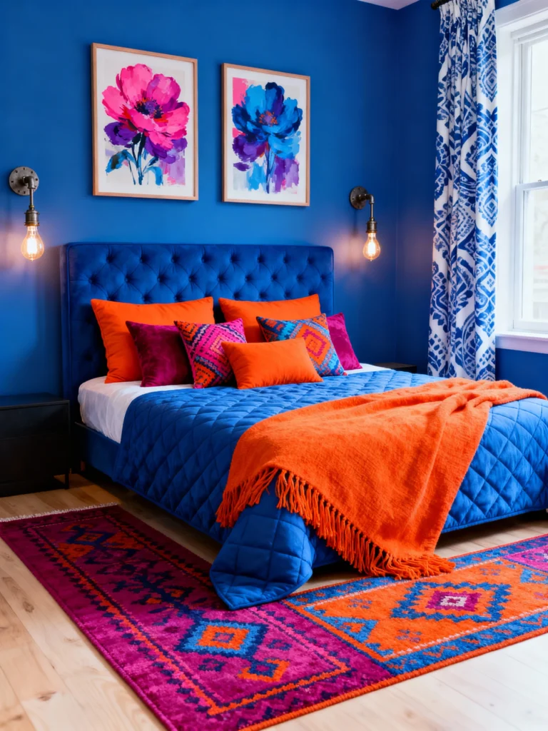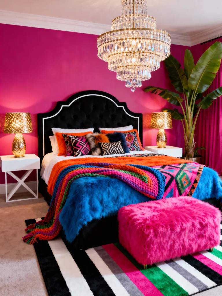 Wow, talk about a mood! This room is for the boldest souls. Hot pink walls are a massive risk, but here they pay off because of the high-contrast black headboard and those metallic gold lamps. It feels like a high-end boutique hotel in Miami. The faux-fur pink ottoman and the striped rug add so much texture and movement. It’s loud, it’s proud, and it’s a masterclass in using “clashing” colors like blue, orange, and pink to create a cohesive, energetic vibe.