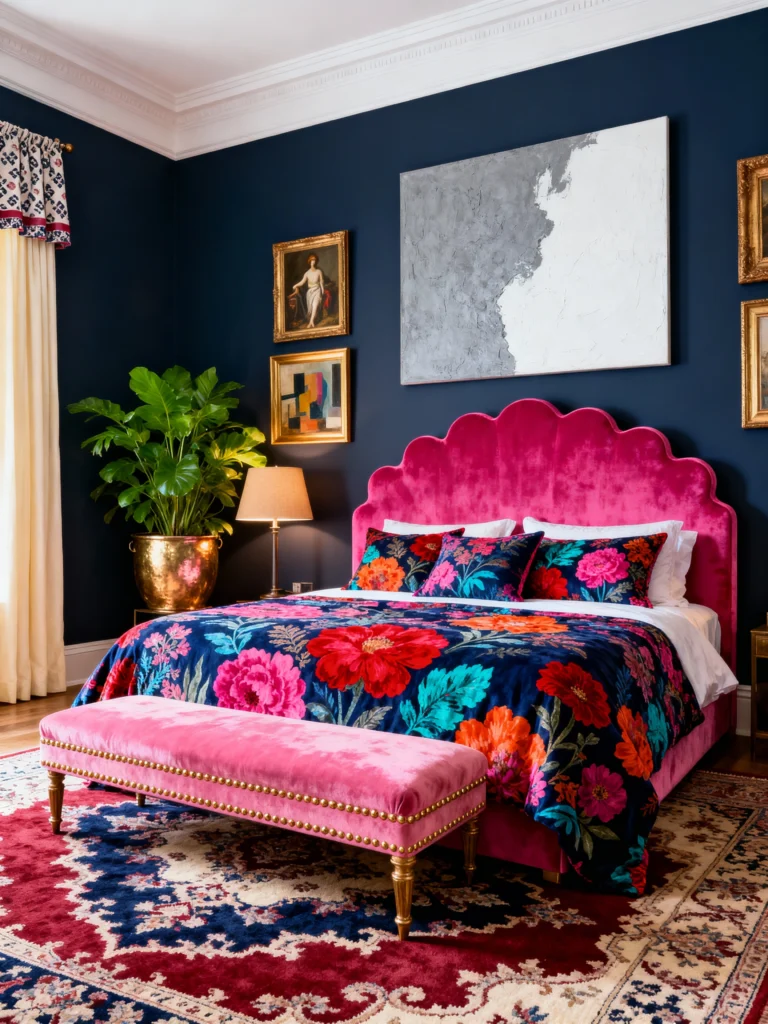 Dark walls are having a major moment, and this deep navy is the perfect backdrop for those pops of fuchsia. The scalloped velvet headboard is such a fun, feminine shape that softens the “moodiness” of the dark paint. What I love most is the scale of the floral print on the duvet—it’s big and dramatic. If you have a room with high ceilings and crown molding like this, don’t be afraid to go dark; it actually makes the space feel more intimate and expensive.