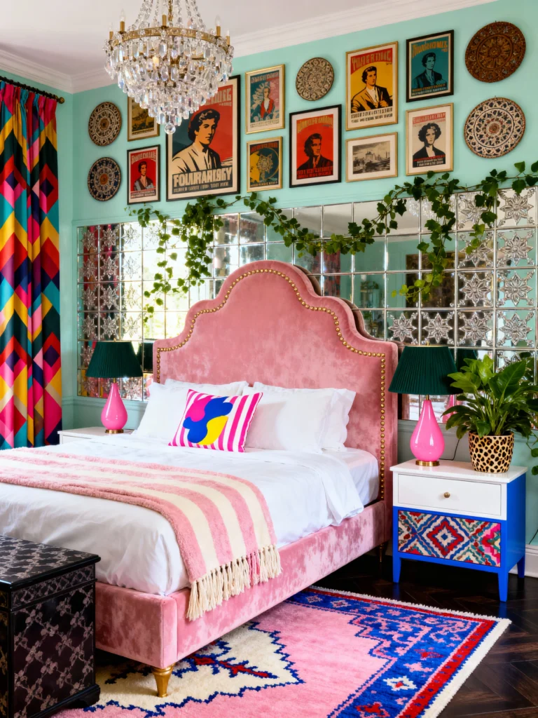 This is “Eclectic Grandmillennial” at its finest. The mint green walls paired with the pink velvet headboard is a classic color combo that never fails. But the real “mic drop” moment? That mirrored wall paneling behind the bed. It adds so much light and vintage character. The mix of pop-art style portraits and traditional plates on the wall shouldn’t work together, but because they are all framed so neatly, it looks like a curated museum exhibit.