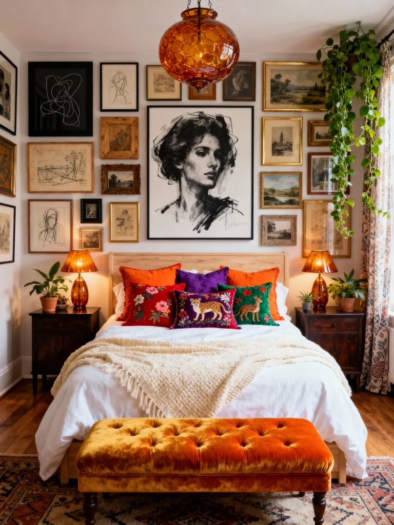 This room feels like it belongs to an artist. The massive black-and-white portrait is a stunning focal point, and it allows the rest of the room to go wild with color. Those velvet pillows in purple, orange, and teal—especially the one with the leopard—add such a playful, “jungle-chic” vibe. It’s a great example of how you can mix different styles of art (sketches, landscapes, and abstracts) on one wall and have it look totally intentional.