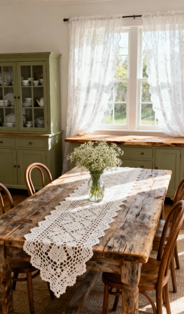 This setup is the definition of sweet, sunny farmhouse charm! I adore how the bright light pours in through the window, filtered by those delicate white lace curtains. The well-loved, rustic wood table, with its chunky legs and natural patina, feels so welcoming. Draping it with that beautiful, intricate crocheted table runner adds a touch of vintage elegance and texture. A simple vase of baby’s breath is all you need for a centerpiece here. Paired with that soft sage green hutch, this room is light, airy, and utterly charming.