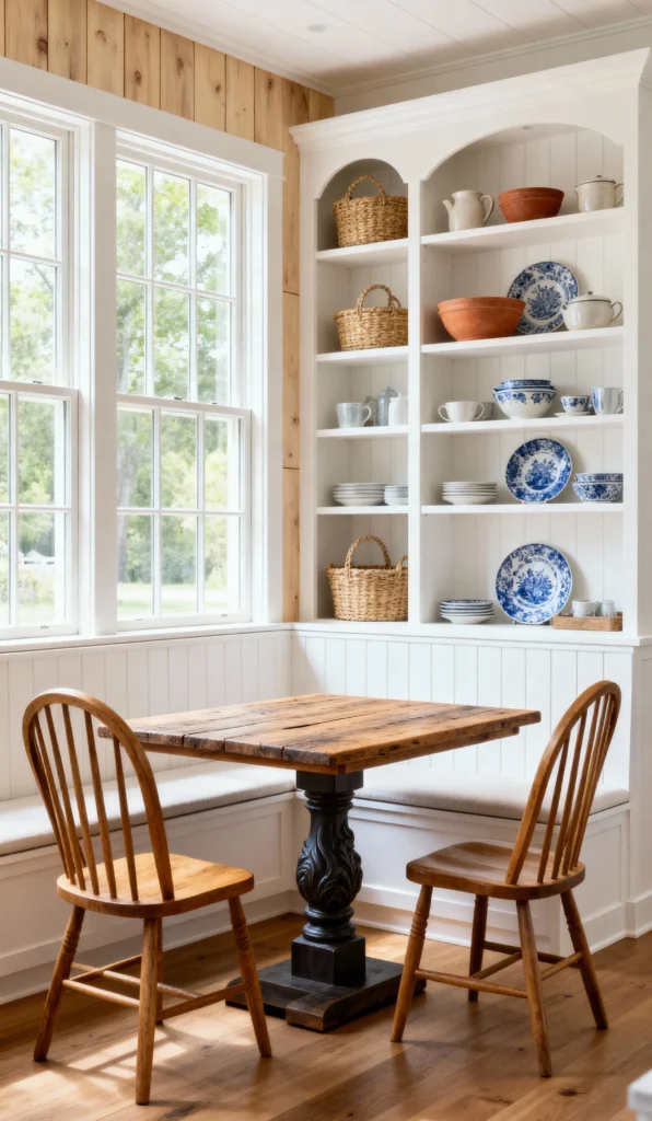 The bright white shiplap walls and built-in bench seating keep the space feeling open and fresh. I love the addition of the arched white display shelves, perfect for showcasing pretty baskets and blue-and-white dishware—it adds a nice pop of color and personality. The small, square rustic table with the dark pedestal base contrasts beautifully with the light windsor-style wooden chairs. It’s a sunny, cheerful spot to start your day!