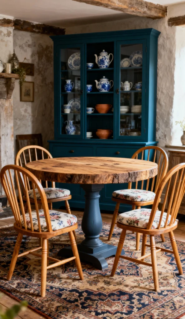 The star of the show has to be that live-edge wooden table, sitting on a chunky, painted base. It brings such warmth and a beautiful organic feel. Surrounding it are those classic wooden Windsor-style chairs, softened with sweet, floral seat cushions—a perfect mix of traditional and cozy. But what truly anchors the space and makes the whole room pop is that magnificent, deep teal display cabinet. Filled with delicate blue and white china, it’s a stunning backdrop and a gorgeous color contrast to the distressed, aged walls and the richly patterned rug. It’s the perfect spot for long chats and cozy meals.