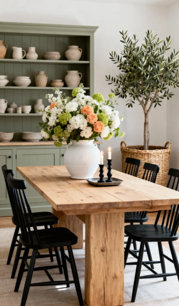 This room is so welcoming and grounded! It takes the farmhouse aesthetic and elevates it with clean lines and a light, airy feel. The thick-cut, natural wood table is the centerpiece, showing off its beautiful grain. It’s perfectly balanced by the clean, stark black spindle chairs. The sage green china cabinet in the background adds a soothing, earthy tone, complemented by the olive tree in the woven basket. The huge white floral arrangement ties the fresh, natural colors together beautifully.