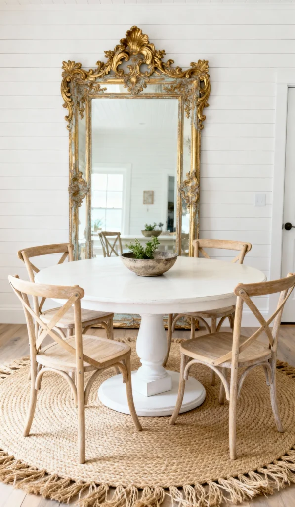 This space is a beautiful blend of rustic and refined. The neutral palette is classic coastal, but the oversized, ornate gold mirror brings in incredible French-inspired glamour. The simple round white pedestal table and light-toned Bentwood chairs keep the look airy and relaxed. Grounding the space with a big, textured jute rug is a perfect way to add that rustic, natural feel. It’s chic, bright, and perfect for a stylish brunch!