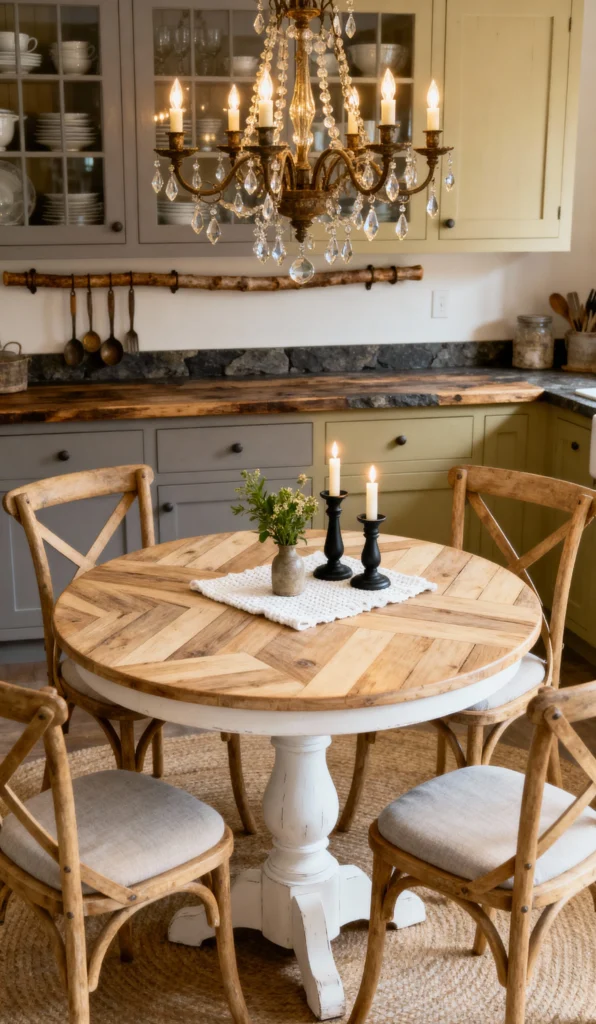 The round dining table with its eye-catching chevron or herringbone pattern in the wood is a fantastic way to add visual interest. The white pedestal base keeps the look light and classic. I love the contrast with the exposed wood cabinetry and the charming, vintage crystal chandelier—it adds a touch of sparkle and soft candlelight. The simple X-back chairs and the rustic kitchen backdrop complete this sweet, intimate dining area.
