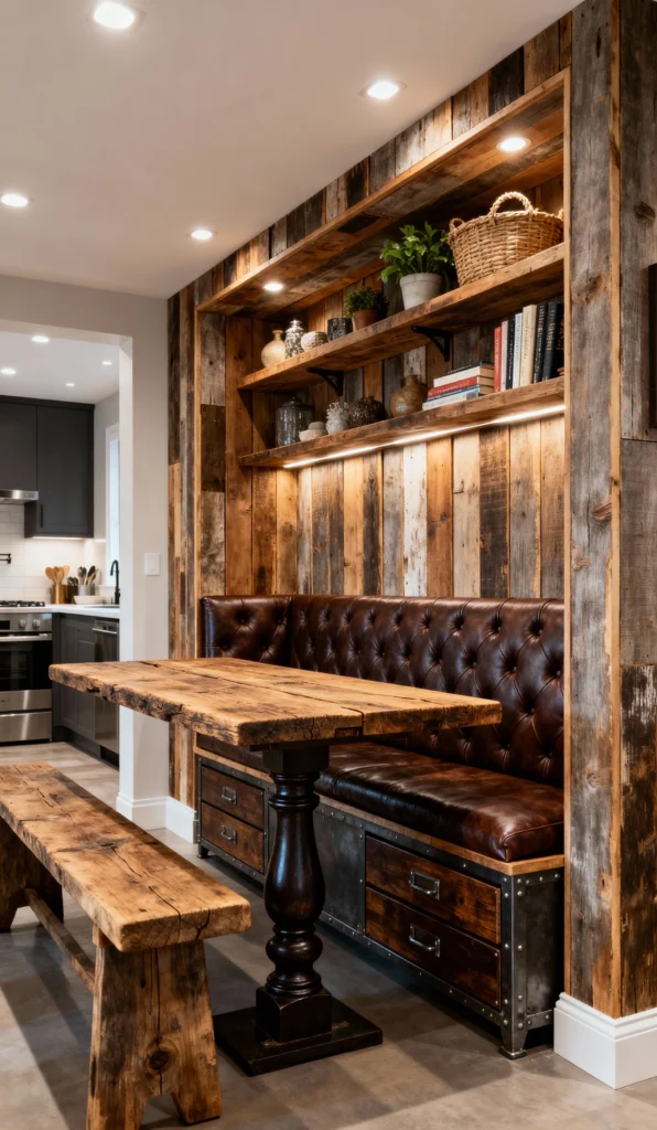 It’s giving off major industrial-meets-rustic vibes. The patchwork reclaimed wood wall with floating shelves is an incredible feature, bringing so much warmth and texture. The dark leather tufted banquette seating looks incredibly luxurious and comfortable, providing built-in storage underneath. Paired with the hefty, dark wood table and simple bench, this setup maximizes space and style. It’s a sophisticated, cozy corner for casual dining right off the kitchen.