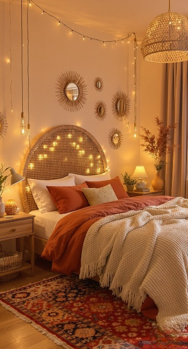 This room is all about ambiance! The star of the show is that gorgeous arched rattan headboard subtly outlined with delicate fairy lights—it’s pure magic. The cluster of small, round sunburst mirrors on the wall adds a fun, textural element. Paired with a deep rust duvet, a cozy knit throw, and a vintage-style rug, this room feels incredibly intimate and ready for a relaxing evening.