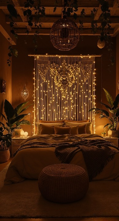 this is boho taken in a moody, dramatic direction! The deep, earthy tones combined with the darkness feel super intimate. The huge macrame wall hanging lit up by what looks like a curtain of twinkling string lights is absolutely mesmerizing—it makes the whole wall glow. The abundance of large indoor plants and the woven textures overhead complete this sophisticated, cozy nighttime jungle vibe.
