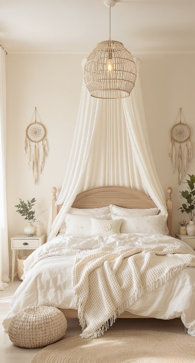 This room is bursting with warmth and texture! The rich terracotta wall color is so inviting, especially paired with that gorgeous woven pendant light and the soft, blush tones in the bedding. The macrame hangings and circular mirror above the bed add a lovely, handcrafted element. And can we talk about that sheer canopy drape? It instantly creates a cozy, dreamy little nook. It’s a perfect blend of cozy and chic.