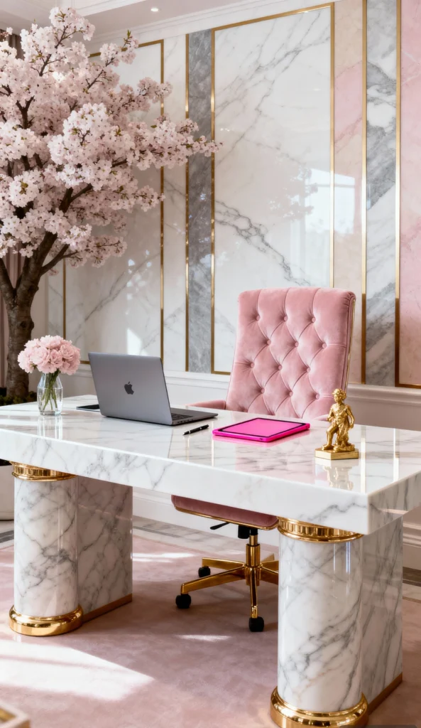 This office is for the ultimate boss who deserves to feel like royalty every single day! the stunning combination of white and grey marble with those chunky gold accents is pure, luxurious glamour. And that tufted pink velvet chair? It’s the perfect mix of soft femininity and serious business. The delicate cherry blossom tree adds such a beautiful, gentle touch to this highly sophisticated space.