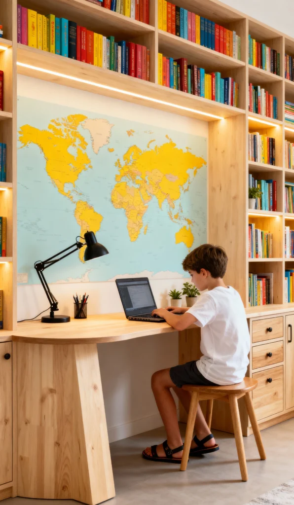 This one is for the students in your life! this clever design incorporates a desk right into the built-in, floor-to-ceiling wooden bookshelves. The lighting strip and the big, bright yellow world map are perfect educational touches that make this space fun and engaging. It’s an ideal, organized “learning nook” that encourages curiosity while providing a dedicated, distraction-free spot for homework.