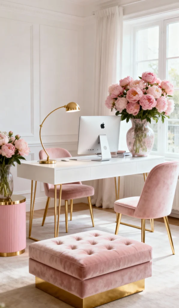 Talk about light and bright! this space feels incredibly fresh and inviting. The crisp white desk paired with the soft blush pink velvet chairs and that gorgeous gold lamp strikes the perfect balance. But let’s be real, the true showstopper here is that absolutely massive, overflowing vase of pink peonies. It instantly elevates the room, turning a simple workspace into a beautiful, serene haven.