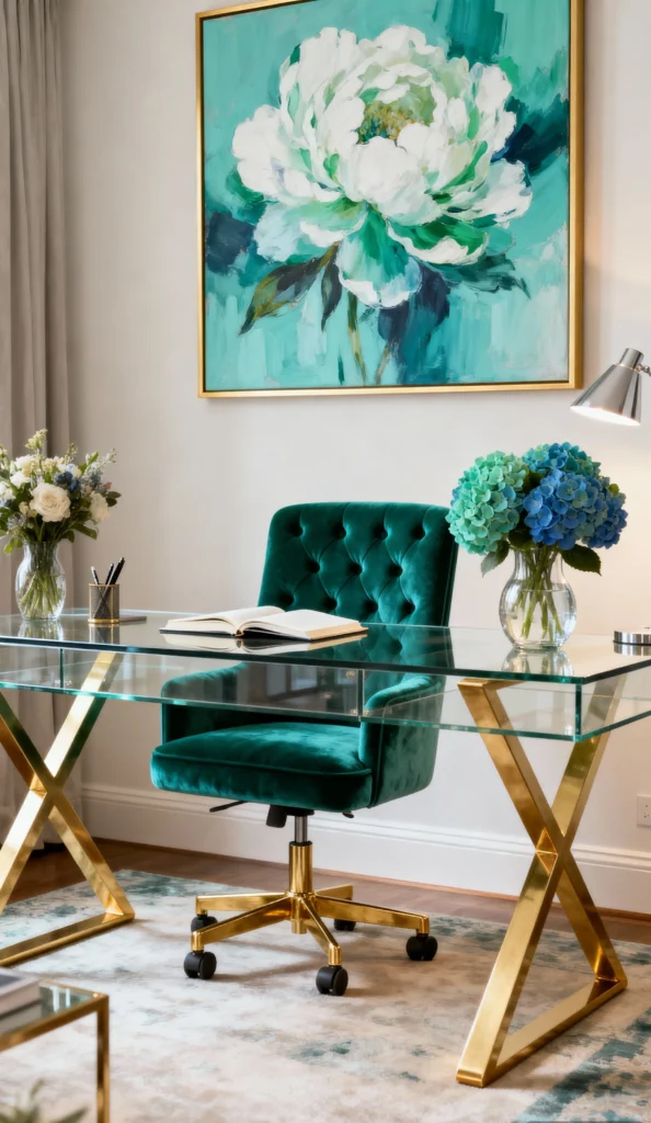 If you love a deep, saturated color, this is it! the desk is a study in modern chic, featuring a sleek glass top supported by striking golden X-frame legs. The centerpiece is, of course, that deeply tufted emerald green velvet chair—it looks unbelievably comfortable and adds such a rich pop of color. The matching green and blue artwork ties the whole luxurious, jewel-toned look together beautifully.