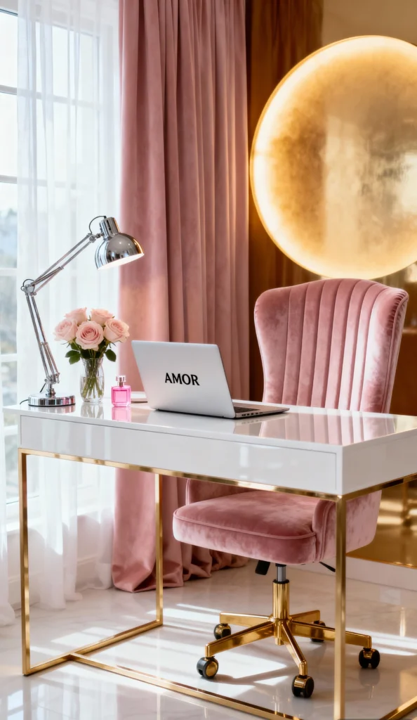This office screams high-fashion and romance! the combination of the high-gloss white desk and those dramatic blush velvet curtains creates a dreamy, soft ambiance. The pleated pink velvet chair looks like a perfect cloud to sit on, and the gold accents on the frame and the unique circular wall art add that necessary touch of glam. It’s a chic, feminine spot to tackle your to-do list.