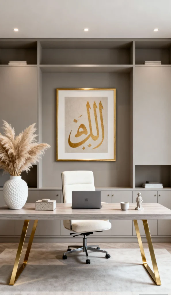 For those who love a calm, uncluttered space, this office is a winner. the palette is beautifully muted with soft grey shelving and a light wood desk. The white chair and the simple accessories keep the focus clean and minimal. The standout piece is the stunning gold Arabic calligraphy art—it adds a meaningful focal point and a beautiful touch of luxury and culture to the tranquil environment.