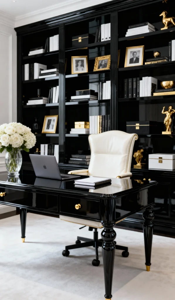 Wow, this space means serious business! this office makes an incredibly powerful and sophisticated statement. The bold choice of high-gloss black furniture for both the desk and the towering built-in bookcase is striking. The crisp white leather chair and strategic gold accents on the frames, handles, and small statues provide a perfect, sharp contrast, giving it a very classic, executive feel.