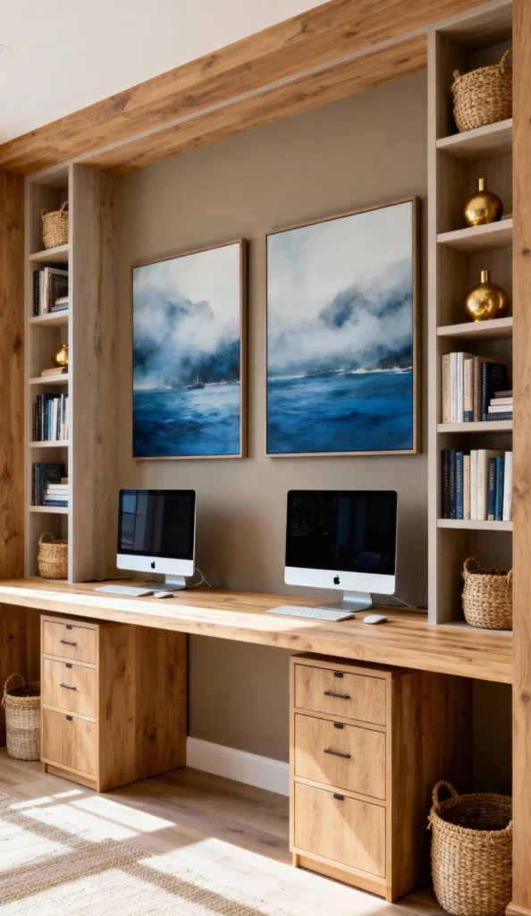 Working with a partner or need extra space? This setup is fantastic! B the long, built-in natural wood desk and shelving is both practical and stylish, offering plenty of storage. The symmetrical design with two computer monitors is perfect for a shared workspace. The breathtaking, moody blue ocean paintings are a gorgeous choice, bringing a calming, artistic element to this functional space.