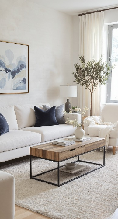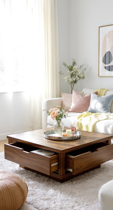 This square dark wood table is a dream for keeping things tidy! The hidden drawers on all four sides offer tons of storage for magazines, remote controls, or cozy blankets, helping you maintain that clean, minimalist look. The low profile and rich color balance the bright white sofa beautifully. It’s the perfect mix of form and function.