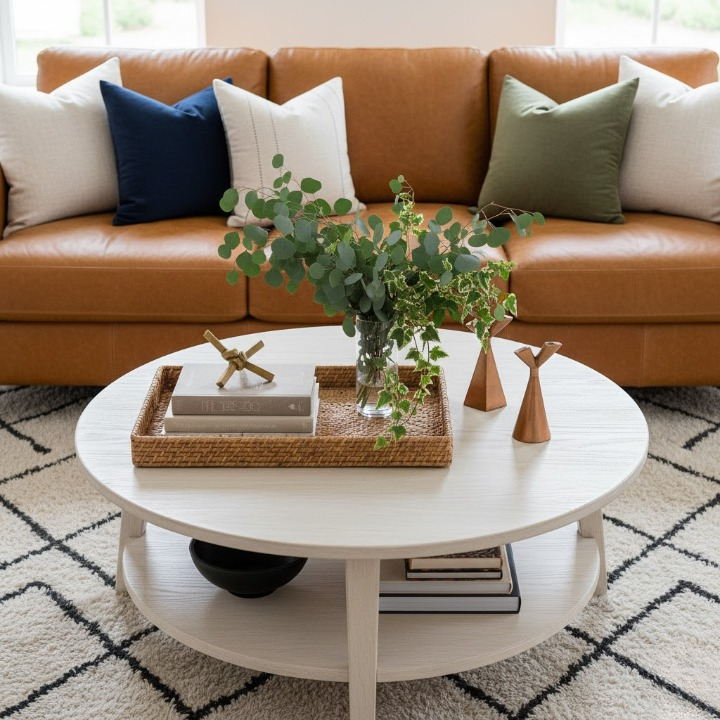This bright, open-plan living space features a bold, oversized round coffee table. Its light, stone-like texture and substantial size anchor the large sectional sofa beautifully. It’s minimal, modern, and the perfect foundation for a simple, curated centerpiece, keeping the whole space looking calm and luxurious.