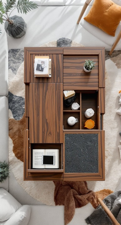 Talk about a table that does it all! This overhead shot shows a fantastic modular design with beautiful, dark, wood grain. It’s like a stylish puzzle you can reconfigure or open up to reveal different compartments. Perfect for the organized decorator who loves a rich, sophisticated aesthetic and appreciates a clever space-saver.